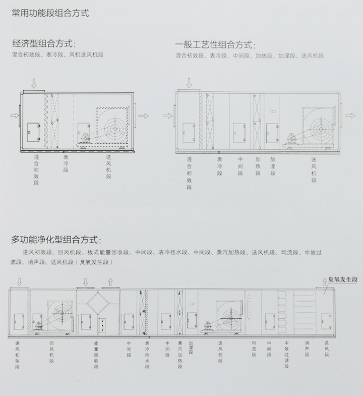 常用功能段組合方式:經(jīng)濟(jì)型組合方式,混合初效段、表冷段、風(fēng)機(jī)送風(fēng)機(jī)段。一般工藝性組合方式,混合初效段、表冷段、中間段、加熱段、加濕段、送風(fēng)機(jī)段。多功能凈化型組合方式:進(jìn)風(fēng)初效段、回風(fēng)機(jī)段、板式能量回收段、中間段、表冷擋水段、中間段、蒸汽加熱段、送風(fēng)機(jī)段、均流段、中效過(guò)濾段、消聲段、送風(fēng)機(jī)段(臭氧發(fā)生斷)