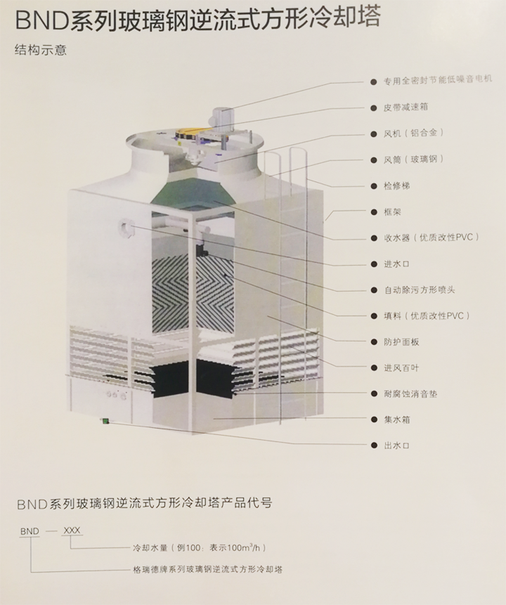 機械工業部第四設計研究院設計的節能型逆流式玻璃鋼冷卻塔,是在原設計的同類塔測試數據基礎上改進設計的。本設計應用了四院獲得的“節能型玻璃鋼冷卻塔”專利(專利號:88215994.1)。
