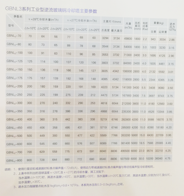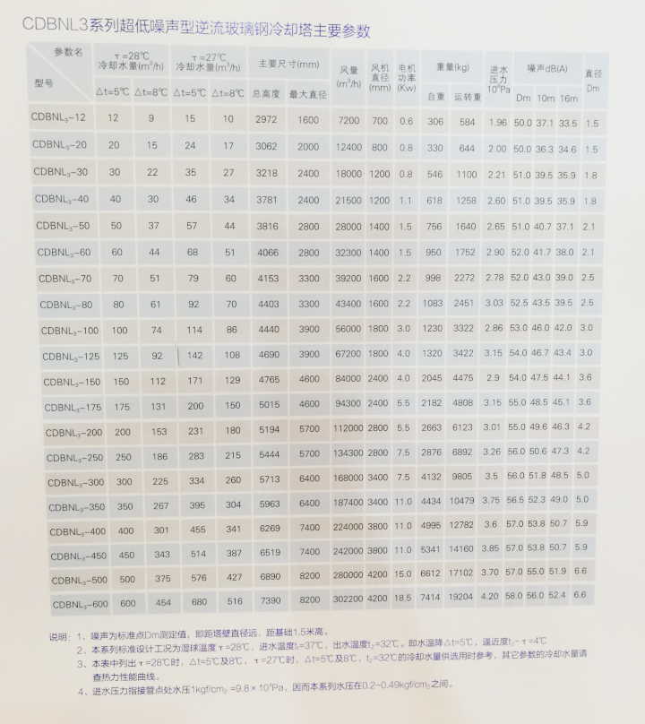 機械工業部第四設計研究院設計的節能型逆流式玻璃鋼冷卻塔,是在原設計的同類塔測試數據基礎上改進設計的。本設計應用了四院獲得的“節能型玻璃鋼冷卻塔”專利(專利號:88215994.1)。